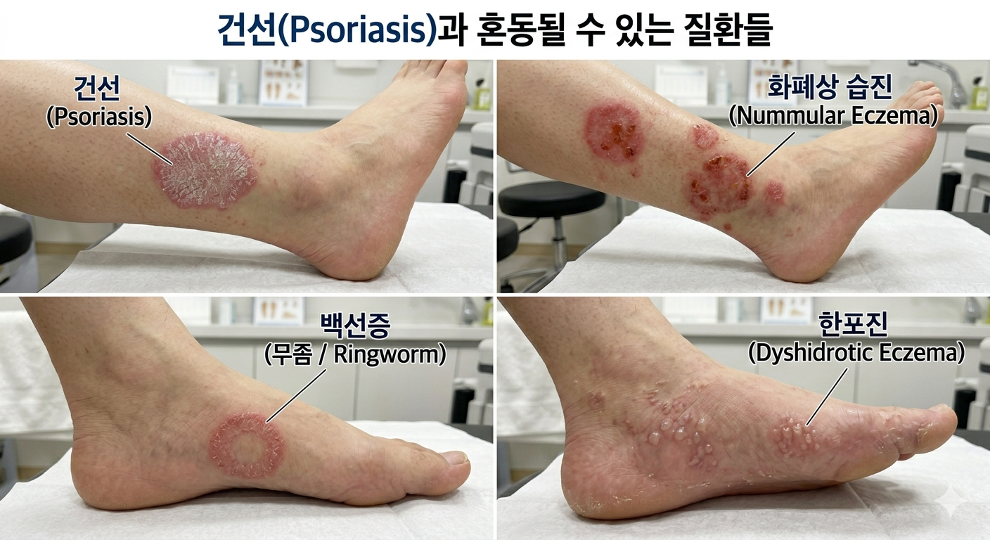 백선(무좀 포함)은 곰팡이 감염으로 발생하는 전염성 질환으로, 건선과는 원인 자체가 완전히 다릅니다.